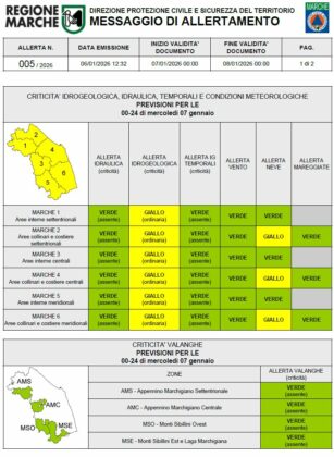PESARO – La giornata di domani, mercoledì 7 gennaio 2026, sarà caratterizzata da condizioni di tempo instabile su tutta la regione Marche, a causa del transito di una massa d’aria fredda che interesserà il territorio soprattutto nelle ore mattutine. Secondo le previsioni del Centro Funzionale Multirischi della Regione Marche, il cielo si presenterà nuvoloso con una graduale attenuazione della copertura dal pomeriggio, quando si assisterà a un temporaneo miglioramento delle condizioni atmosferiche. Nella prima parte della giornata sono attese precipitazioni deboli e sparse, con maggiori accumuli nelle zone montane meridionali. I fenomeni assumeranno carattere nevoso fino alle quote collinari basse, mentre lungo la costa non si escludono brevi nevicate o pioggia mista a neve, soprattutto al mattino.