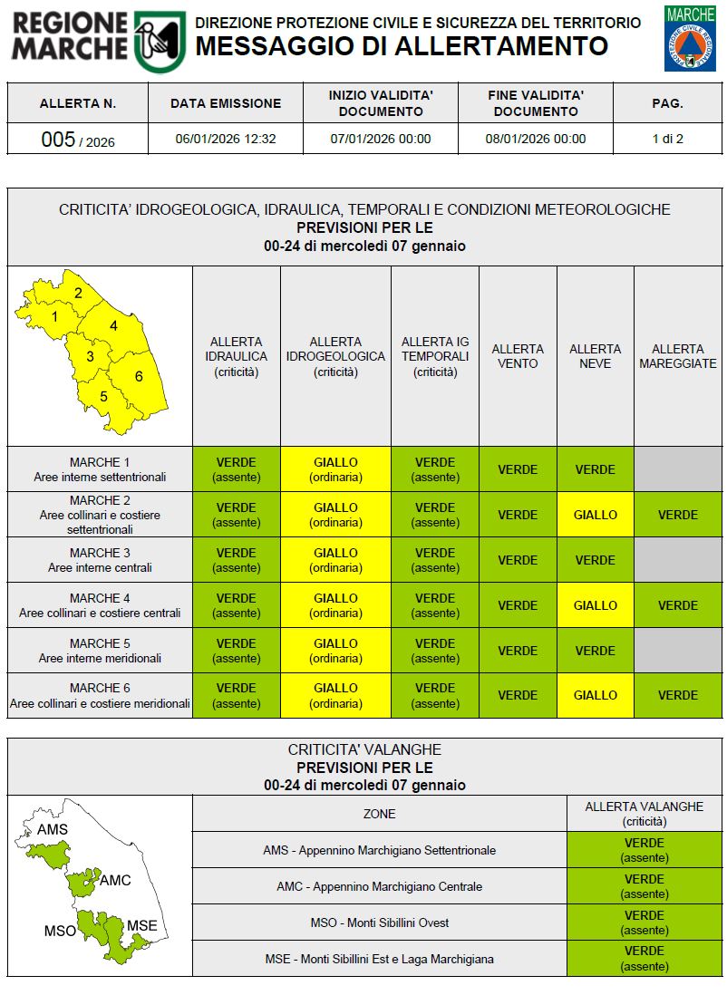La Protezione Civile delle Marche ha diramato l’allerta meteo gialla per domani: