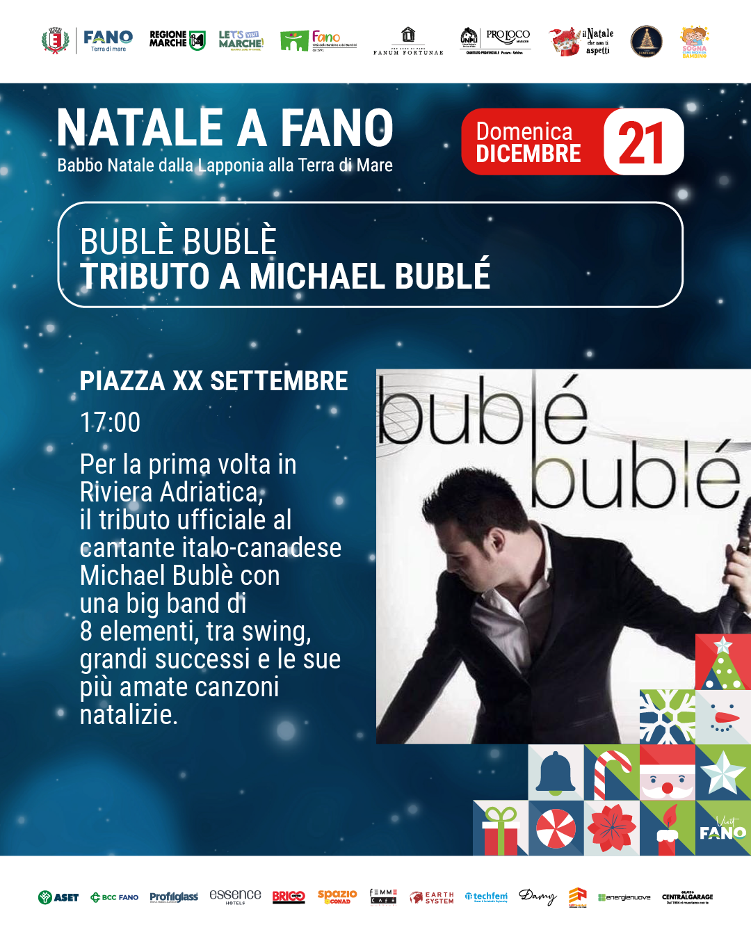 Domenica 21, sempre sotto l’albero in Piazza XX Settembre alle 17, l’atmosfera verrà accesa da un evento speciale: per la prima volta sulla Riviera Adriatica arriva Bublé Bublé, la big band ufficiale dedicata all’icona italo-canadese Michael Bublé. Otto musicisti sul palco daranno vita a un elegante e coinvolgente tributo tra swing, atmosfere jazz e i grandi classici natalizi dell’artista, in un concerto pensato per emozionare e avvolgere il pubblico in un abbraccio musicale. Lo spettacolo è pensato per tutte le età e promette un’esperienza emozionante e avvolgente, in cui musica, atmosfera e suggestione si incontrano nella cornice più suggestiva del Natale fanese. Un appuntamento da vivere con il cuore aperto, in famiglia, tra amici, o semplicemente per lasciarsi trasportare dal ritmo raffinato che ha reso Bublé un simbolo mondiale delle festività.