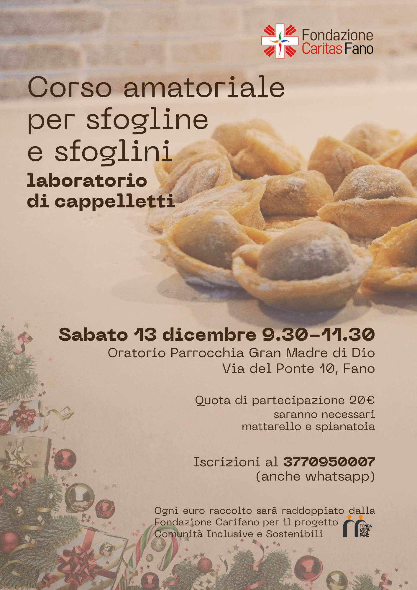 FANO – Anche quest’anno, in occasione delle festività natalizie, la Fondazione Caritas Fano propone un ricco calendario di iniziative per tutti per sostenere le attività di solidarietà all’interno del progetto “Comunità Inclusive e Solidali”. Durante il mese di dicembre, Caritas invita la cittadinanza a partecipare a diverse iniziative di beneficenza che si terranno in occasione del periodo natalizio. Si parte giovedì 4 dicembre, alle 19.30 con la cena di solidarietà presso il ristorante “Da Fiore” a Fano (Via Roma 203), con un menù che comprende primo, pizza a spicchi, patatine e bevande incluse. La serata prevede un contributo di partecipazione di 30€ per gli adulti e di 10€ per i bambini sotto i dieci anni. La seconda iniziativa si terrà sabato 13 dicembre, dalle 9.30 alle 11.30 con un laboratorio di cappelletti presso l’oratorio della parrocchia Gran Madre di Dio a Fano (Via del Ponte 10). Una lezione per imparare la preparazione di uno dei piatti simbolo della tradizione natalizia. Il ricavato di entrambe le giornate andrà a sostenere il progetto “Comunità inclusive e Solidali”, all’interno della campagna di crowdfunding realizzata con il sostengo della Fondazione Cassa di Risparmio di Fano. Per entrambe le iniziative è necessario prenotarsi scrivendo o contattando il n. 377 0950007. Informazioni e contatti Per maggiori informazioni, è possibile scrivere a: info@caritasfano.net oppure contattare il n. 377 0950007 Aggiornamenti, calendario completo e modalità di partecipazione saranno pubblicati sul sito e sui canali social di Caritas Fano: www.caritasfano.it Facebook & Instagram: @caritasfano La Fondazione Caritas Fano ringrazia tutte le famiglie, i volontari, gli esercenti e i partner che, anche quest’anno, rendono possibile questa grande festa della solidarietà.