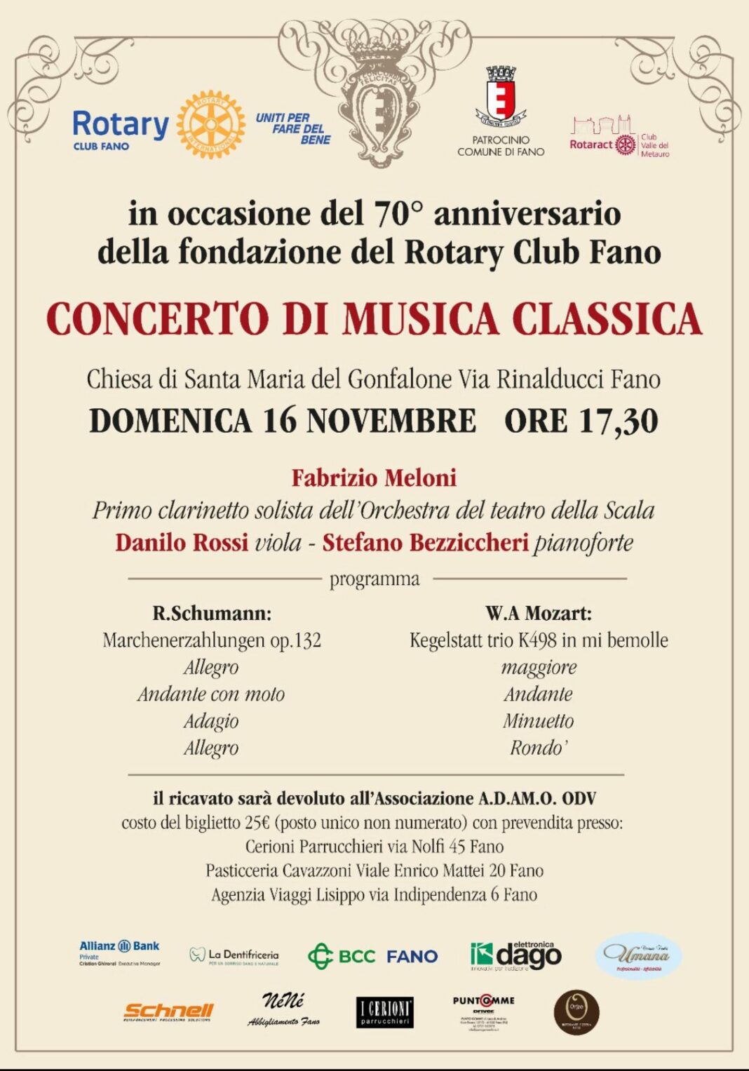Non solo un evento, ma anche un’occasione concreta di coniugare la cultura, grazie alla disponibilità degli illustri Maestri, con la solidarietà ed il sostegno in favore delle realtà fragili del territorio, proprio perché il festeggiamento di questi 70° sarà lo strumento per promuovere un concreto aiuto verso l’associazione fanese A.D.A.M.O. o.d.v., a cui andrà il ricavato del service, la quale con continuità, da anni, è al servizio della cittadinanza.