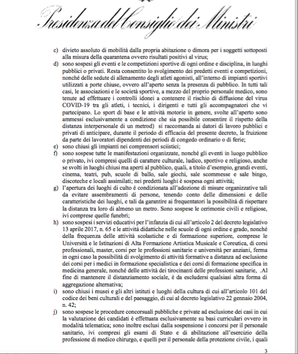 Sull’intero territorio nazionale, prosegue la bozza, “sono sospese le attività di pub, scuole di ballo, sale giochi, sale scommesse e sale bingo, discoteche e locali assimilati” fino al 3 aprile. Sono inoltre previste “specifiche sanzioni in caso di mancato rispetto”. I bar e ristoranti possono rimanere aperti se riescono a garantire la distanza di un metro tra una persona e l’altra. Sono confermati gli eventi sportivi a porte chiuse Sempre nelle stesse zone, cioè nella Lombardia e nelle 11 province del nord, s’è deciso di tenere “chiusi gli impianti nei comprensori sciistici”. Sempre secondo la bozza, chi non rispetti i limiti agli spostamenti e le nuove misure per fronteggiare il Coronavirus disposti in queste zone può essere punito con l’arresto fino a 3 mesi e fino 206 euro di ammenda. Praticamente si tratta delle stesse sanzioni già previste per chi violava le prime disposizioni assunte per le zone rosse. Infine, il governo “raccomanda di limitare la mobilità al di fuori dei propri luoghi di dimora abituale ai casi strettamente necessari”.