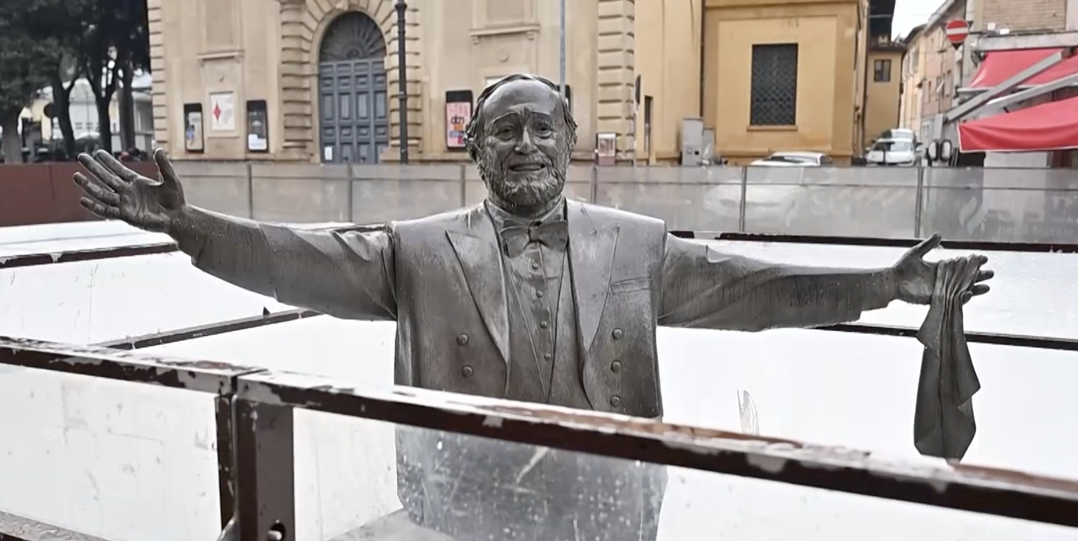 PESARO – Sorpresa in piazza Lazzarini: la statua di Luciano Pavarotti finisce “intrappolata” nella nuova pista di ghiaccio allestita davanti al Teatro Rossini. L’opera appare più bassa di quasi mezzo metro, con le gambe nascoste sotto la struttura e solo busto e braccia visibili. Le immagini hanno fatto rapidamente il giro dei social, scatenando commenti e battute. La pista, accolta positivamente dai commercianti dopo l’insuccesso della location periferica dello scorso Natale, misura 24 per 12 metri: dimensioni standard che, in quell’area, lasciano la statua esattamente al centro. Lo spostamento non è stato possibile per garantire il passaggio dei mezzi di soccorso. Sui social interviene con ironia anche il sindaco Biancani, che lancia l’hashtag “#daiuncinqueaPavarotti”. Intanto cresce la curiosità dei passanti, che si fermano a fotografare il “Maestro nel ghiaccio”, mentre gli operai installano protezioni laterali per evitare urti e assicurare la sicurezza dei pattinatori. I lavori procedono verso l’inaugurazione del 29 novembre: quando si accenderà l’albero di Natale, anche Pavarotti sarà lì, in una versione inedita ma ancora una volta al centro della scena.