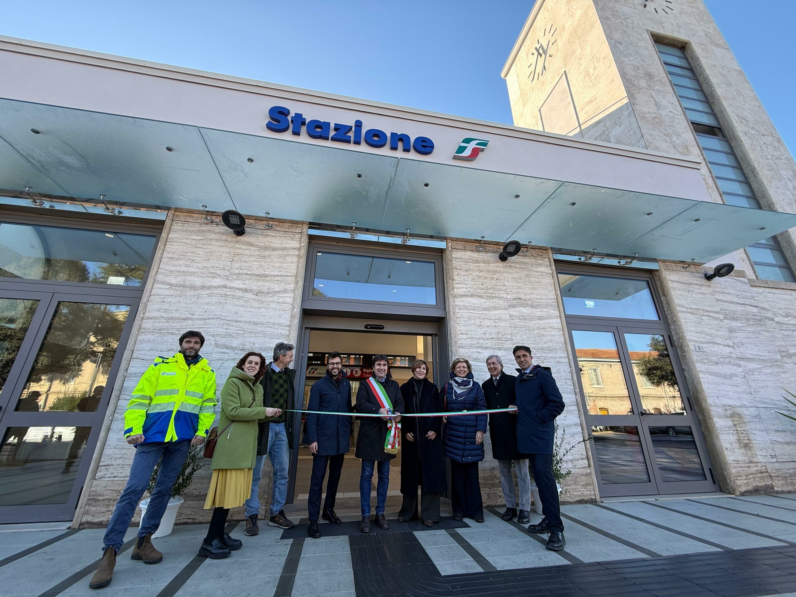 PESARO – «Da oggi Pesaro ha una nuova piazza: un bel biglietto da visita curato, bello, funzionale e accessibile per i quasi 2 milioni di persone che si spostano in treno», così il sindaco Andrea Biancani e l’assessore alle Nuove opere Riccardo Pozzi alla presentazione del restyling della stazione ferroviaria e delle aree esterne di viale del Risorgimento, eseguito da RFI per restituire «spazi più accessibili, sicuri e integrati con il contesto urbano, con nuovi percorsi pedonali, illuminazione, arredi e servizi per i viaggiatori» come ha spiegato Francesca Cerrone responsabile Investimenti Centro – Direzione Stazioni di Rete Ferroviaria Italiana.