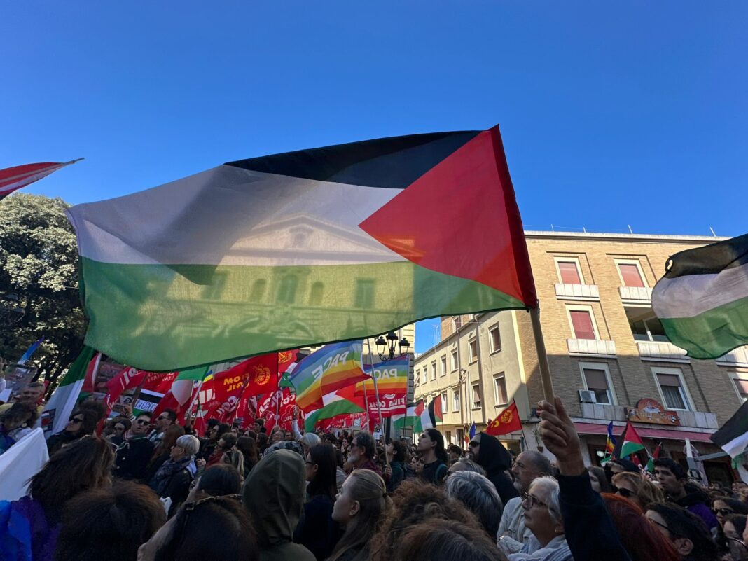 Piazza Lazzarini gremita a Pesaro per chiedere la fine della guerra a Gaza. Centinaia di persone, tra studenti, docenti, sindacati, Anpi, associazioni e politici, hanno aderito al presidio promosso con lo slogan “Cessate il fuoco”. “Il sangue risparmiato fa storia come quello versato”, si leggeva su uno dei cartelli esposti. “La città ha dimostrato sensibilità – ha detto Roberto Rossini, segretario provinciale Cgil –. Gaza è un grido che arriva fino a noi”. Manifestazioni analoghe si sono svolte oggi in numerose città italiane, da Milano a Palermo. L’appello alla pace si lega anche al recente abbordaggio della nave umanitaria Global Sumud Flotilla da parte delle forze israeliane al largo di Gaza.