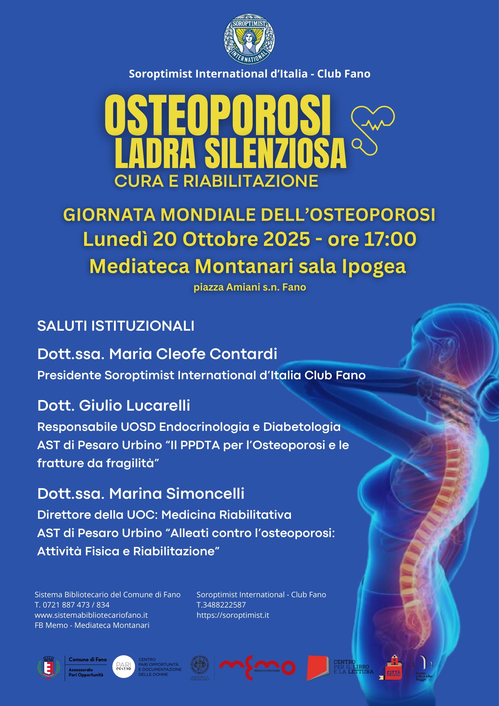 Il 20 ottobre, giornata mondiale dell’osteoporosi, il Soroptimist terrà una conferenza presso la Mediateca Montanari Me.Mo. per affrontare in maniera integrata questa patologia e per illustrate lo stile di vita utile alla prevenzione e le migliori pratiche per curarla.