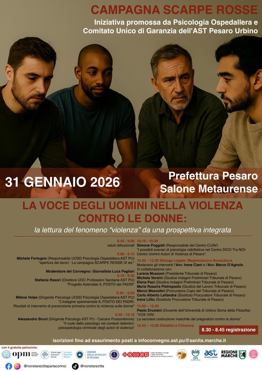 PESARO – Sabato 31 gennaio, dalle 8:30, il Salone Metaurense della Prefettura di Pesaro ospiterà il convegno conclusivo della IX edizione del “Progetto Scarpe Rosse” dell’AST Pesaro Urbino. L’evento, intitolato “La voce degli uomini nella violenza contro le donne”, è un’iniziativa promossa da Psicologia Ospedaliera e Comitato Unico di Garanzia dell’AST Pesaro Urbino e si propone di sviluppare un’analisi multidisciplinare focalizzata sul lessico e sui comportamenti dell’uomo, con l’obiettivo di scardinare alla radice i meccanismi del fenomeno.