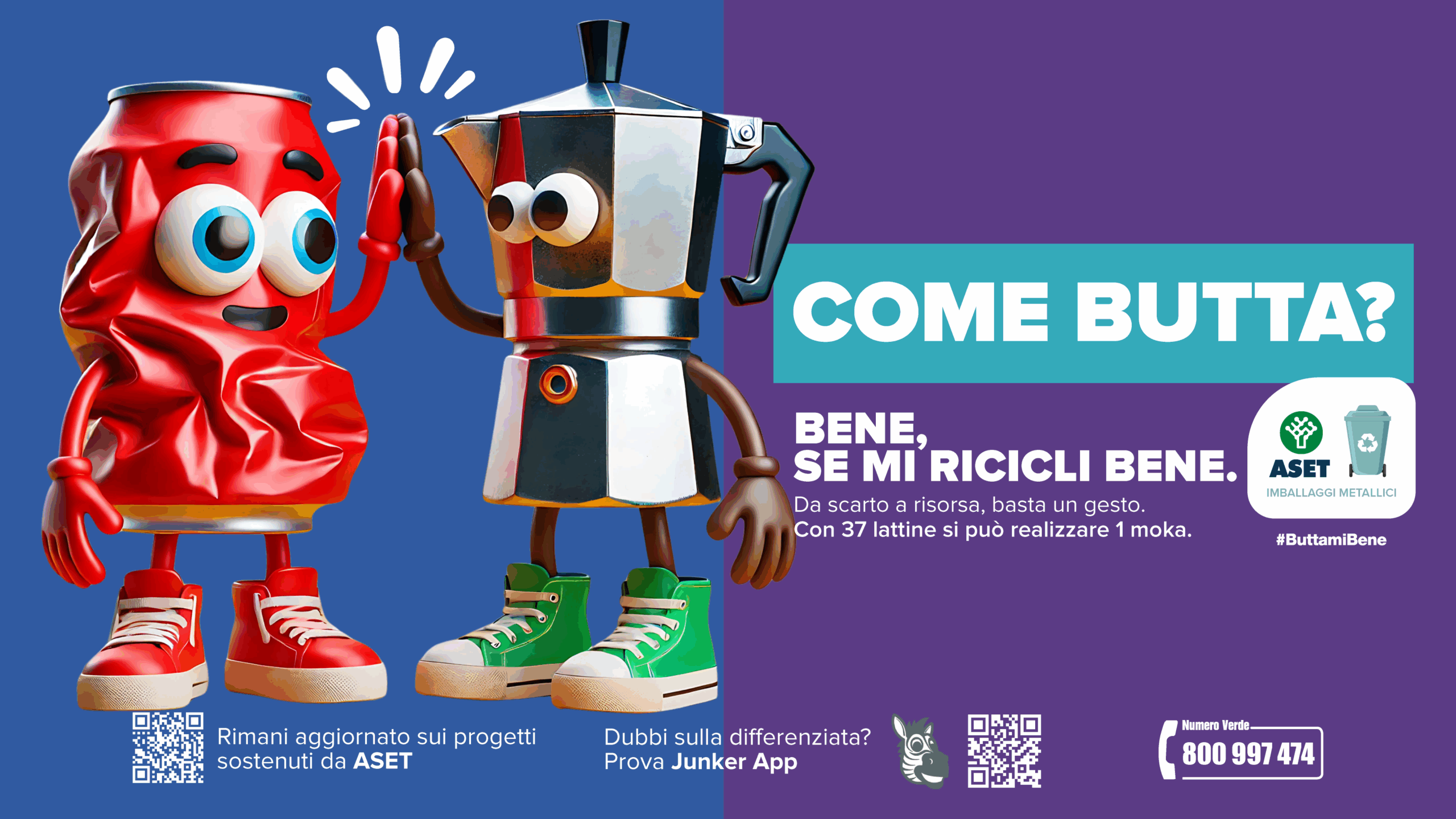 È in questo contesto – fatto di risultati importanti ma anche di nuove sfide – che nasce “COME BUTTA?”, la nuova campagna di sensibilizzazione realizzata da Comunica Media Agency per Aset Spa per coinvolgere i cittadini in un miglioramento complessivo sia della quantità sia della qualità della raccolta differenziata. Un progetto pensato non solo per comunicare, ma per educare in modo concreto e duraturo.