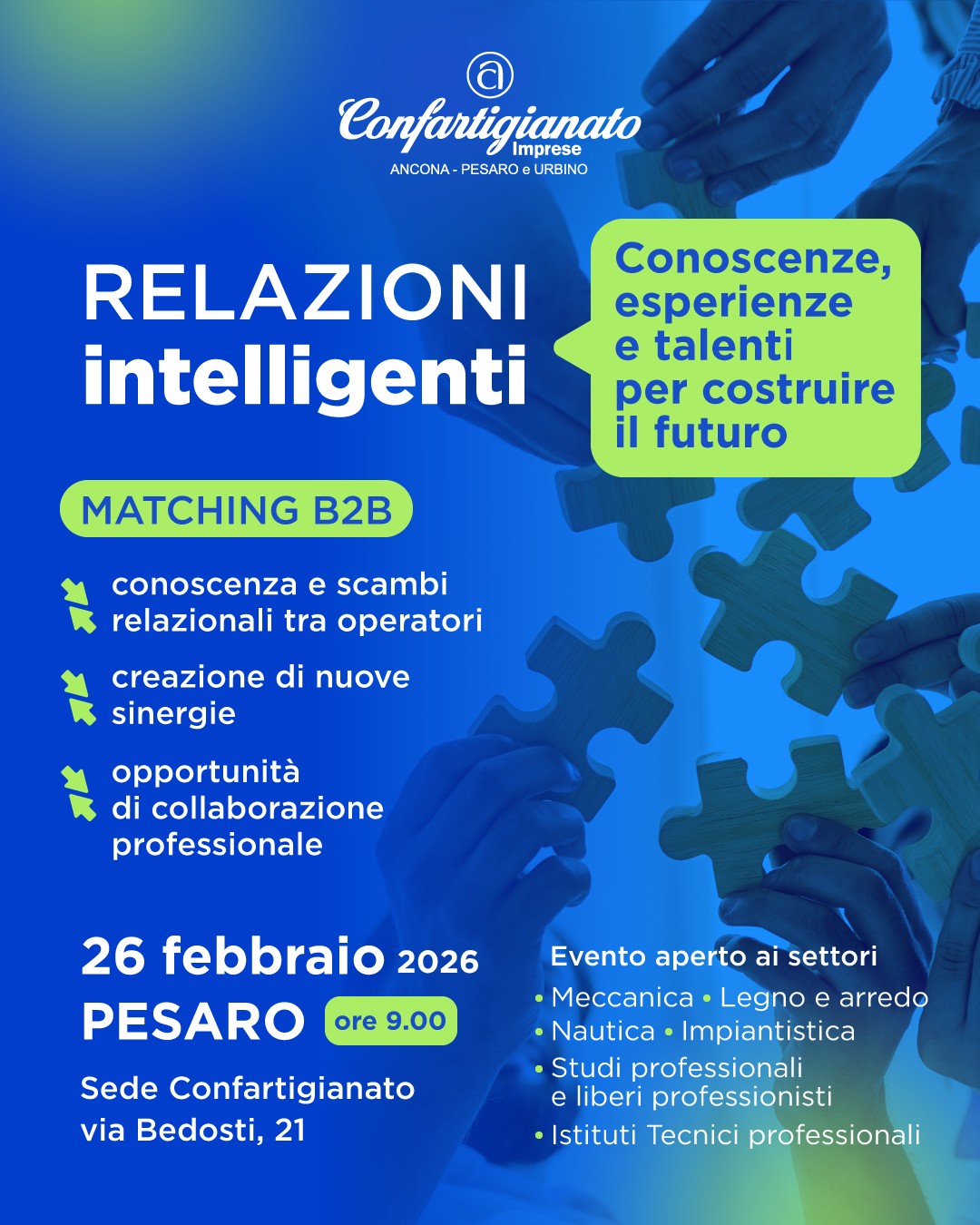 PESARO – E’ in programma giovedì 26 febbraio, dalle ore 9 alle ore 13, presso la sede di Confartigianato di Pesaro, l’evento “Relazioni intelligenti – Conoscenze, esperienze e talenti per costruire il futuro”. Un appuntamento dedicato alle imprese del settore legno, arredo, nautica, meccanica ed impiantistica che avranno l’occasione di incontrarsi per conoscersi e per avviare opportunità lavorative, collaborazioni professionali e facilitare scambi relazionali. In un’ottica di integrazione tra competenze produttive, formative e professionali, al matching B2B prenderanno parte anche alcuni studi professionali di ingegneri, architetti e geometri, nonché gli istituti tecnici del nostro territorio.