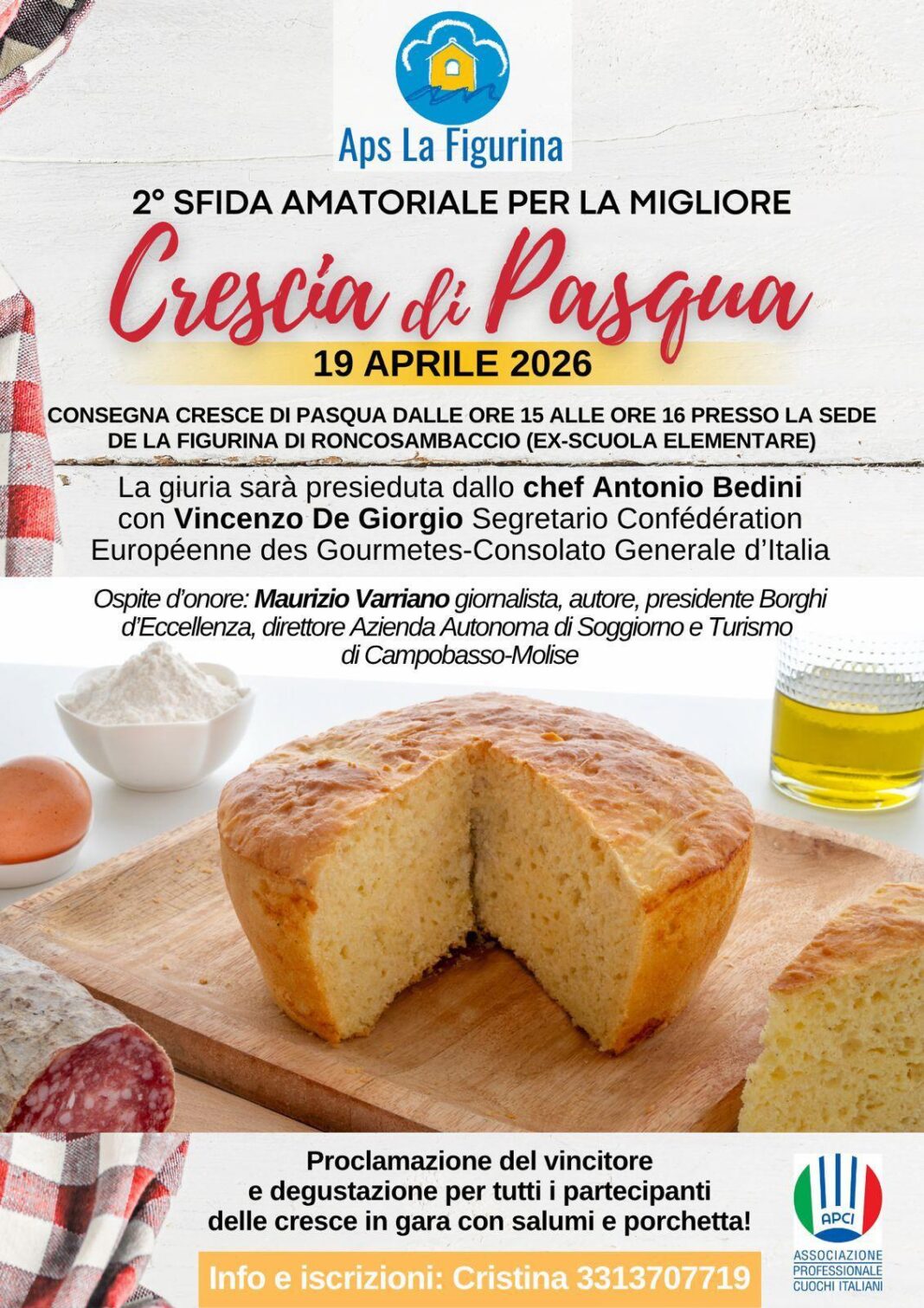 La consegna delle crescie in gara è prevista dalle ore 15 alle 16 presso la sede della Figurina di Roncosambaccio (ex scuola elementare). A valutare le preparazioni sarà una giuria d’eccezione presieduta dallo chef Antonio Bedini, maestro e discepolo Escoffier, affiancato da Vincenzo De Giorgio. Tra gli ospiti il giornalista Maurizio Varriano, figura di riferimento nel panorama turistico e culturale italiano.