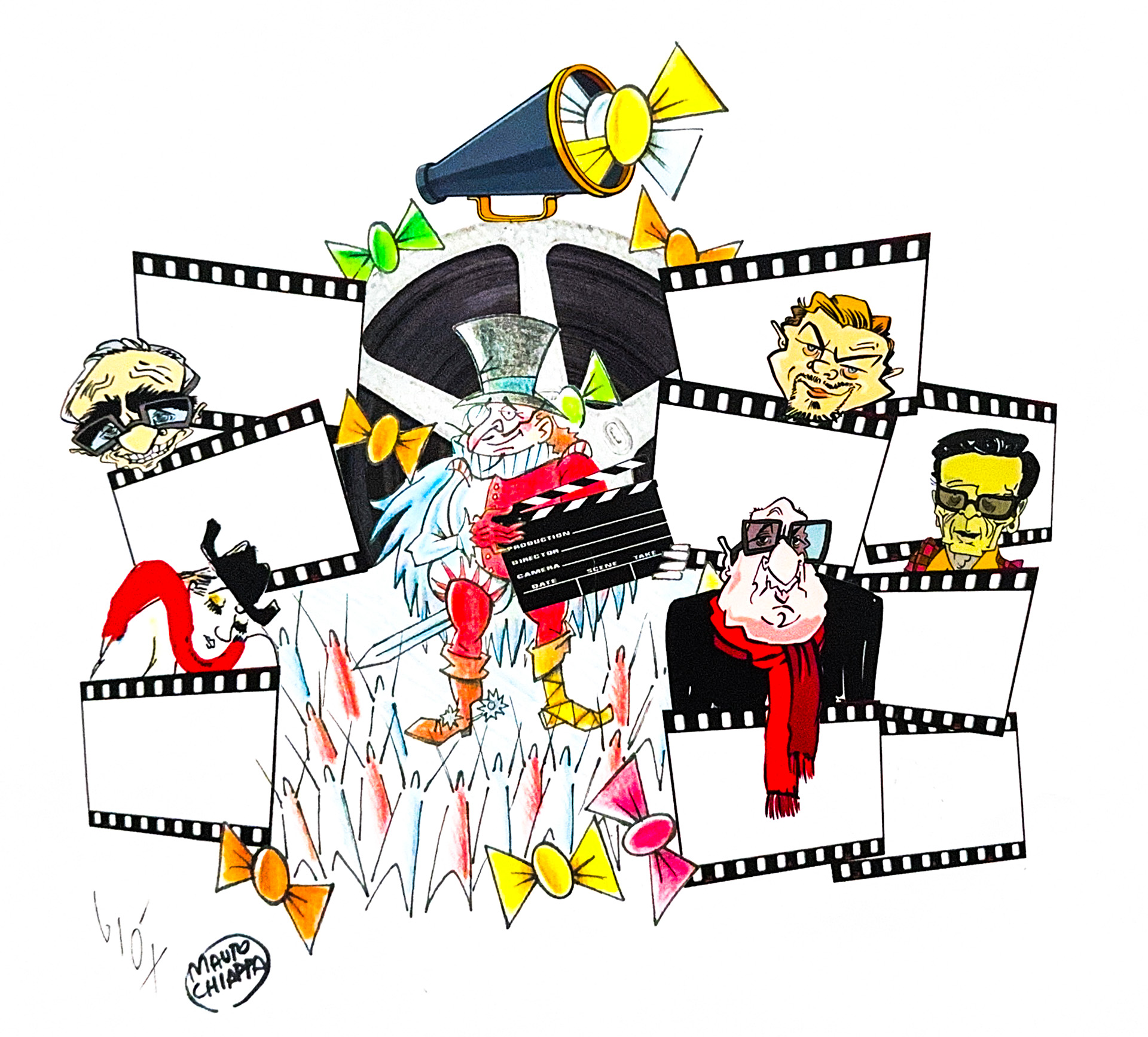Il carro di presentazione, in versione CINEMA, vuol rendere omaggio al tre volte premio Oscar, lo scenografo Dante Ferretti. Il Vulòn indossa le vesti del regista e al posto della tradizionale mandola ha in mano il ciak pronto a dare il via al film del divertimento e trasgressione. Gli faranno compagnia la caricatura di Dante Ferretti, dei registi Federico Fellini, Pier Paolo Pasolini, Tim Burton, Martin Scorsese, degli attori Leonardo Di Caprio, Paolo Villaggio e Roberto Benigni. La grande ruota sarà trasformata nella classica “pizza” di film sormontata dal megafono del regista, usato come prendigetto! Montati su nuove cornici/pellicole, i bozzetti dell’autore e gli scatti di scena dai più importanti film in cui ha lavorato faranno da scenografia in un tripudio di stelle e caramelle, a celebrare la grande arte di Ferretti.