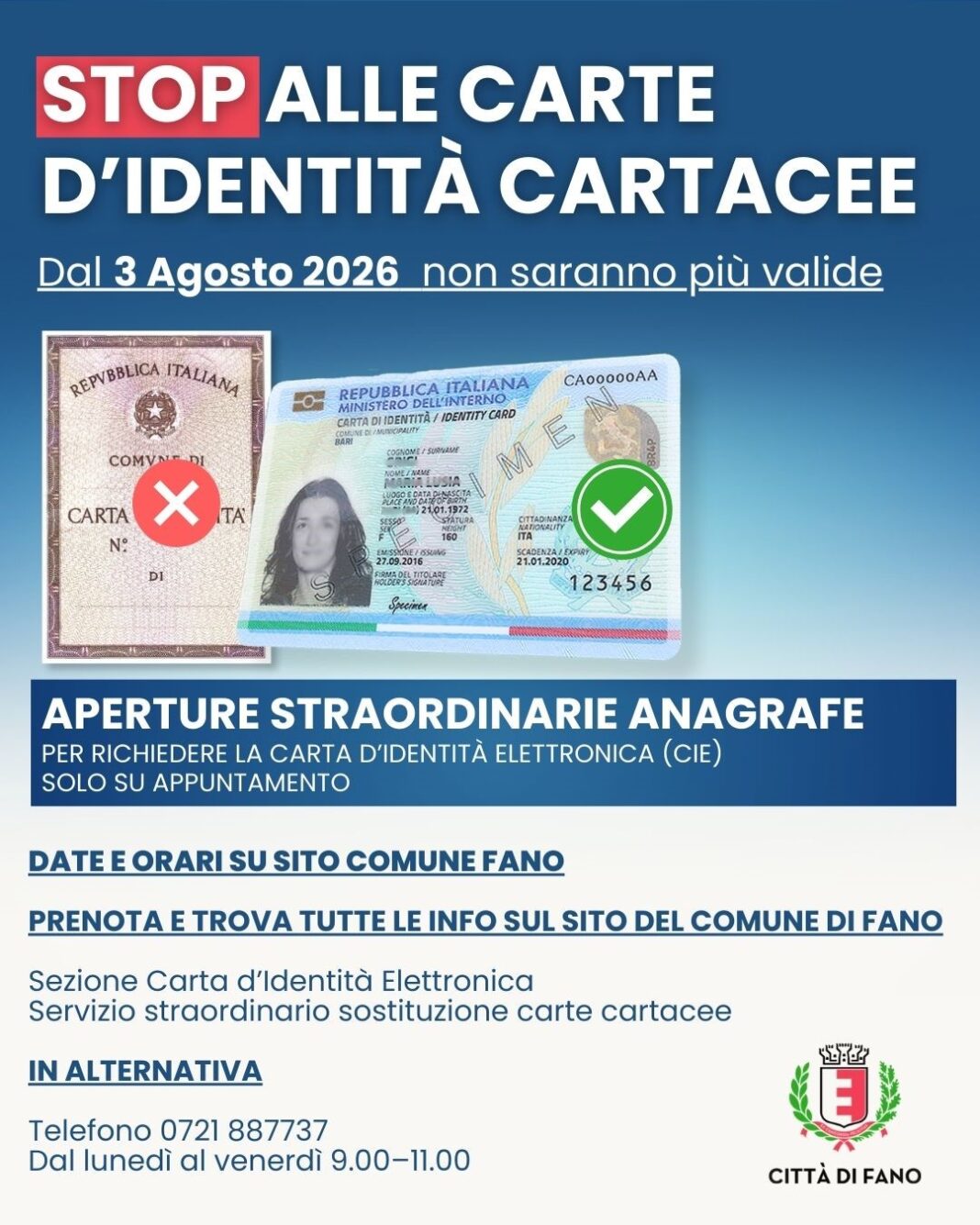 Il Comune invita i cittadini a verificare per tempo la tipologia di documento in proprio possesso e a programmare la sostituzione prima della scadenza del 3 agosto 2026. Per info https://www.comune.fano.pu.it/ Novita/Notizie/STOP-ALLE- CARTE-D-IDENTITA-CARTACEE- APERTURE-STRAORDINARIE-DEGLI- SPORTELLI