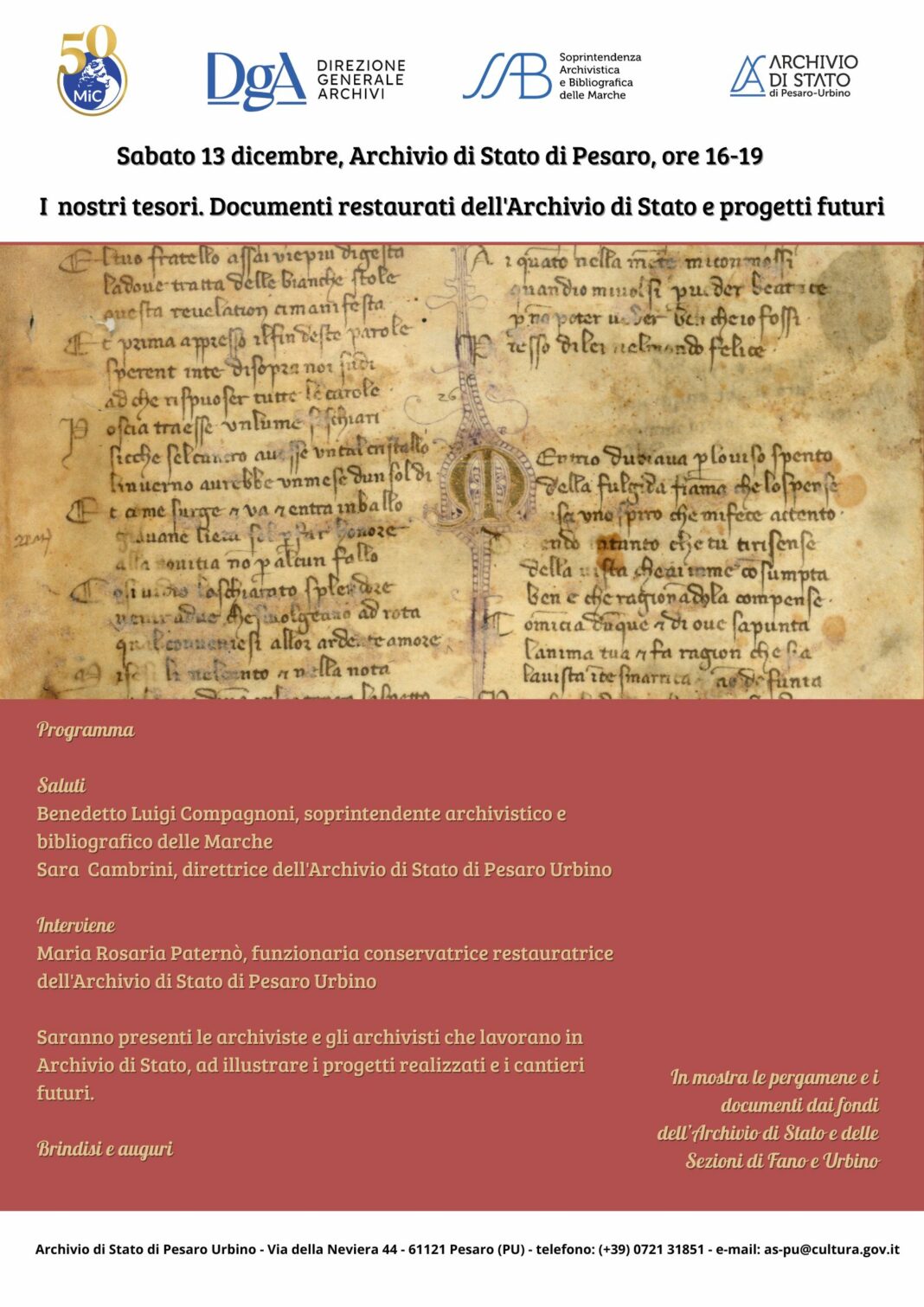 Saranno anche presentati i progetti di restauro dell’Archivio di Stato per il futuro, che hanno l’obiettivo di restituire altri preziosi frammenti di pergamena di reimpiego dalla Sezione di Archivio di Stato di Urbino, e registri di straordinaria importanza storica del fondo Notarile di Pesaro, come il Libro delle matricole dei notai dal 1658 al 1818; un altro importantissimo registro settecentesco del Notarile di Pesaro e il catato del territorio feretrano del secolo XVI recentemente individuato dal fondo Mattei Gentili.
