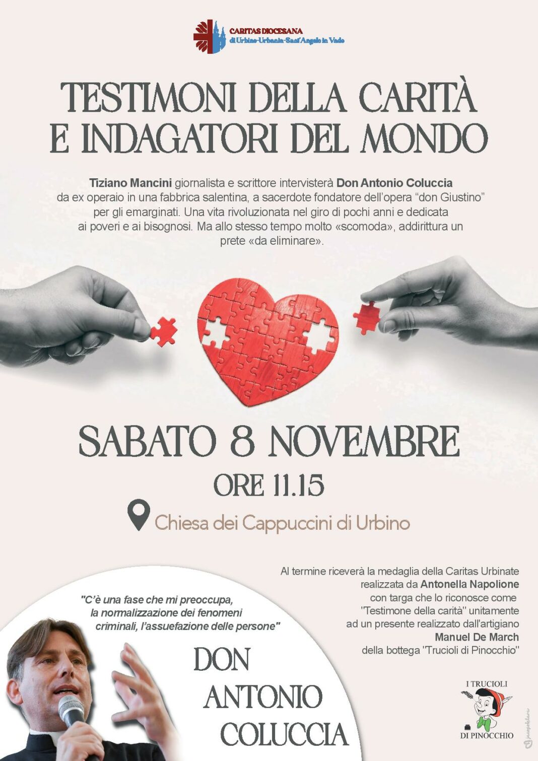 Al termine, don Antonio Coluccia riceverà la Medaglia della Caritas Urbinate, realizzata dall’artista Antonella Napolione, con una targa che lo riconosce come “Testimone della Carità”, e un presente artigianale di Manuel De March della bottega Trucioli di Pinocchio.
