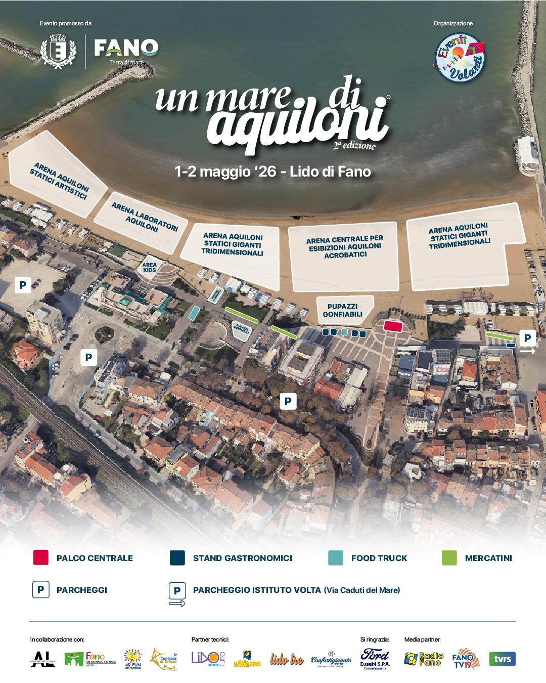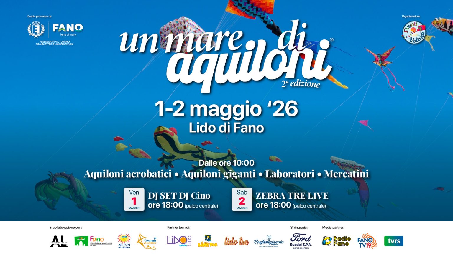 La manifestazione è organizzata da Eventi Volanti, start up specializzata in eventi di aquilonismo, ed è promossa dal Comune di Fano – Assessorato al Turismo, Grandi Eventi e Manifestazioni – in collaborazione con l’associazione Contrade di Urbino, che curerà i laboratori per bambini, e con Arfun Animasion per le attività di animazione. Sarà un lungo weekend in cui Fano si presenterà nel suo volto più autentico: piedi nella sabbia, il vento che gioca con gli aquiloni, la musica che accompagna il mare. E la certezza che, anche se i ristoranti sono pieni, chi arriva all’ultimo troverà comunque un posto a tavola, uno spazio per fermarsi e tutto il cielo che serve per lasciar volare i propri desideri.