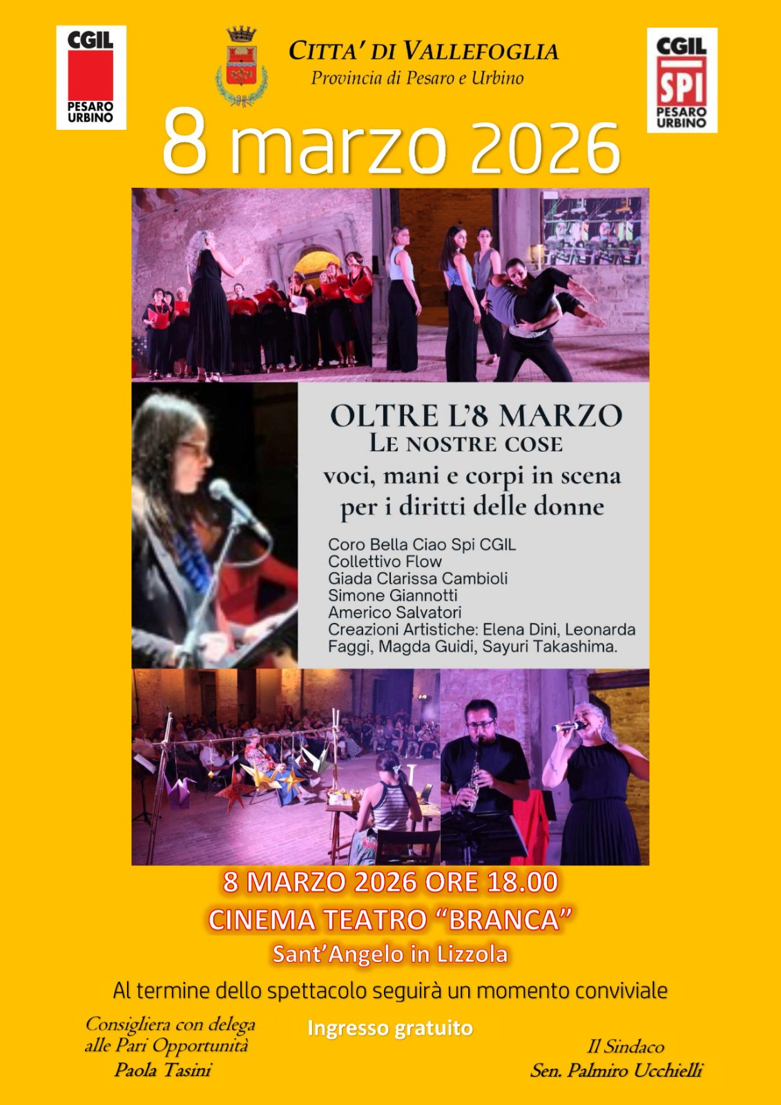collaborazione con CGIL e CGIL (SPI) Pesaro Urbino. La Giunta Comunale ha approvato l’organizzazione della festività, seguita dallanConsigliera con delega alle Pari Opportunità, Paola Tasini, che si terrà domenica 8 marzo 2026 alle ore 18.00 presso il Cine Teatro Branca di Sant’Angelo in Lizzola. L’iniziativa prevede uno spettacolo di intrattenimento a ingresso libero, pensato come momento di aggregazione e valorizzazione del ruolo delle donne nella società contemporanea. Al termine dello spettacolo seguirà un momento conviviale aperto a tutti i partecipanti. L’Amministrazione invita tutta la cittadinanza a partecipare a questo appuntamento significativo, occasione per celebrare insieme una ricorrenza di grande valore civile e sociale.