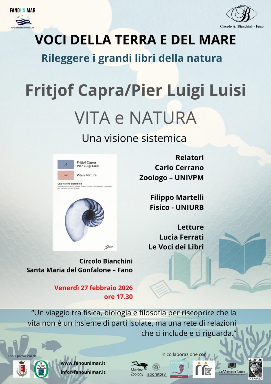 Prendendo spunto dalle tesi di Capra e Luisi, i relatori approfondiranno la necessità di una crescita qualitativa: l’attuale economia dello spreco deve essere sostituita da un modello che metta la vita e la sua sostenibilità al centro degli obiettivi sociali, promuovendo una vera e propria alfabetizzazione ecologica (ecoliteracy). Organizzazione e Patrocini L’iniziativa è promossa da Fano Università del Mare Odv (Fano UniMar) in collaborazione con La Lupus in Fabula, il Circolo A. Bianchini, Le Voci dei Libri, e gode del patrocinio del Comune di Fano, della Fondazione Cassa di Risparmio di Fano, del Parco Naturale del Monte San Bartolo e di prestigiose istituzioni scientifiche come il Marine Zoology Laboratory e Reef Check Italia.